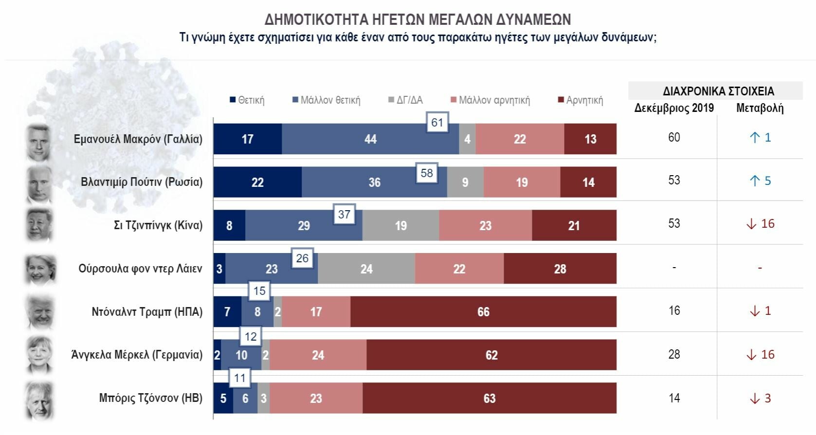 Σε επίπεδο ηγετών μεγάλων δυνάμεων, η τάση ακολουθεί την επιρροή των χωρών τους στην ελληνική κοινωνία. Ο Εμανουέλ Μακρόν απολαμβάνει υψηλά ποσοστά δημοφιλίας (61%) την τελευταία περίοδο και ο Βλαντιμίρ Πούτιν ενισχύει την εικόνα του κατά 5 μονάδες στο 58%. Οι υπόλοιποι ακολουθούν αντίρροπη τάση, με τις μεγαλύτερες απώλειες να καταγράφονται στα πρόσωπα του Σι Τζινπίνγκ, με 37% θετικές γνώμες και πτώση 16% από τον περασμένο Δεκέμβριο, και της Άνγκελα Μέρκελ η οποία υποχωρεί επίσης κατά 16 μονάδες στο 12%, αγγίζοντας τα ιστορικά της χαμηλά στα χρόνια της πρώτης μνημονιακής περιόδου. Τέλος, Ντόναλντ Τραμπ και Μπόρις Τζόνσον κινούνται σε διαρκή χαμηλά επίπεδα της τάξης του 15% και 11% αντίστοιχα, ενώ στην πρώτη μέτρησή της, χαμηλή αποδοχή καταγράφει και η Ούρσουλα φον ντερ Λάιεν στο 26%.