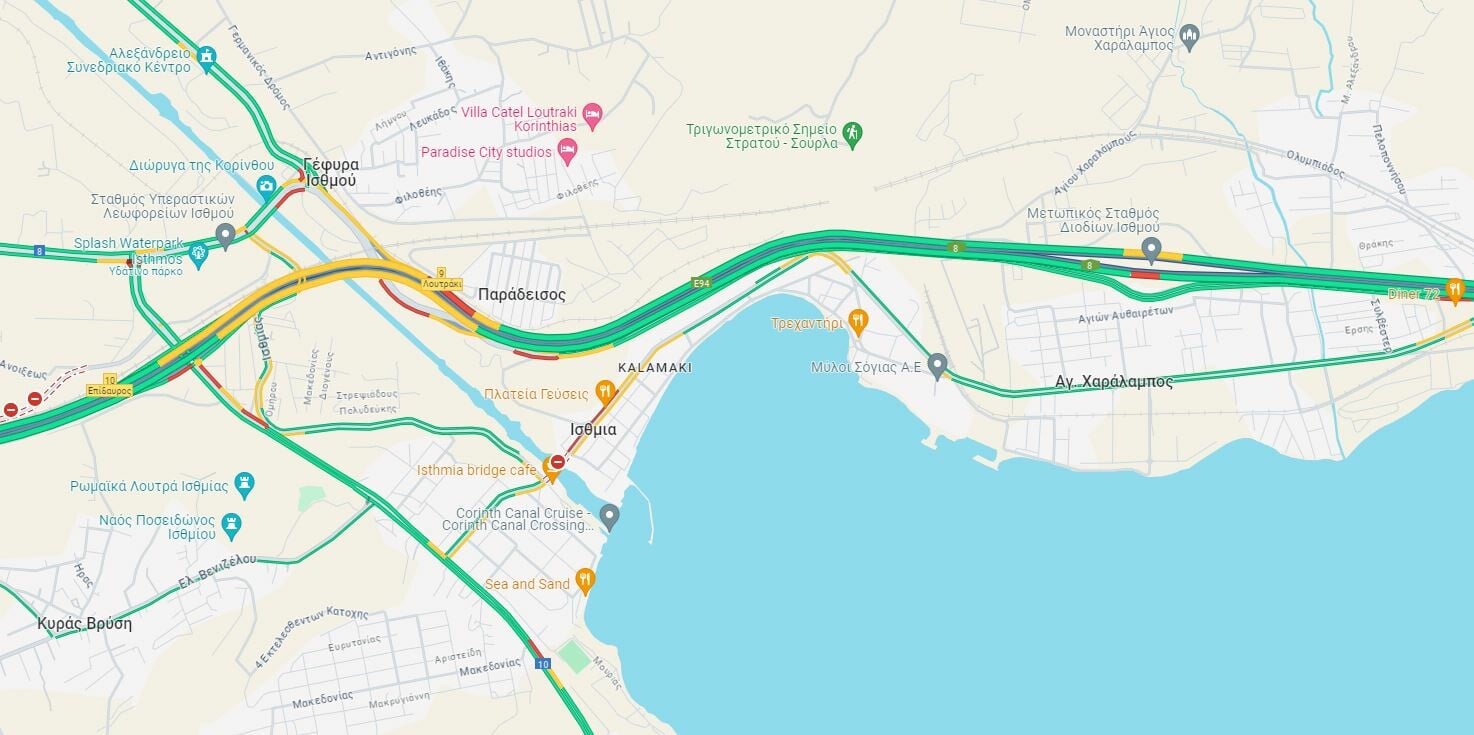 Η εκτροπή των οχημάτων στο ρεύμα από Αθήνα προς Κόρινθο λόγω της διακοπής της κυκλοφορίας στο σημείο κάτω από την αερογέφυρα του Ισθμου γίνεται με έξοδο των οχημάτων από τη νέα Εθνικη Οδό στη Γέφυρα κόμβου Λουτρακίου και είσοδο τους ξανά στη νέα Εθνική οδό στον κόμβο Επιδαύρου.
