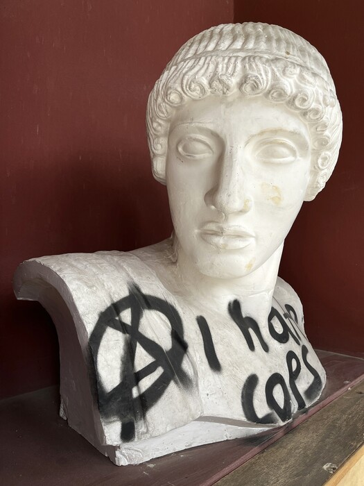 Συνθήματα γραμμένα με σπρέι πάνω σε γύψινα αντίγραφα ή σε τοίχους, ζημιές και γκράφιτι είναι μερικές μόνο από τις εικόνες ντροπής στο Εθνικό Μετσόβιο Πολυτεχνείο που αποτυπώνονται στις φωτογραφίες του Μεγακλή Ρογκάκου.