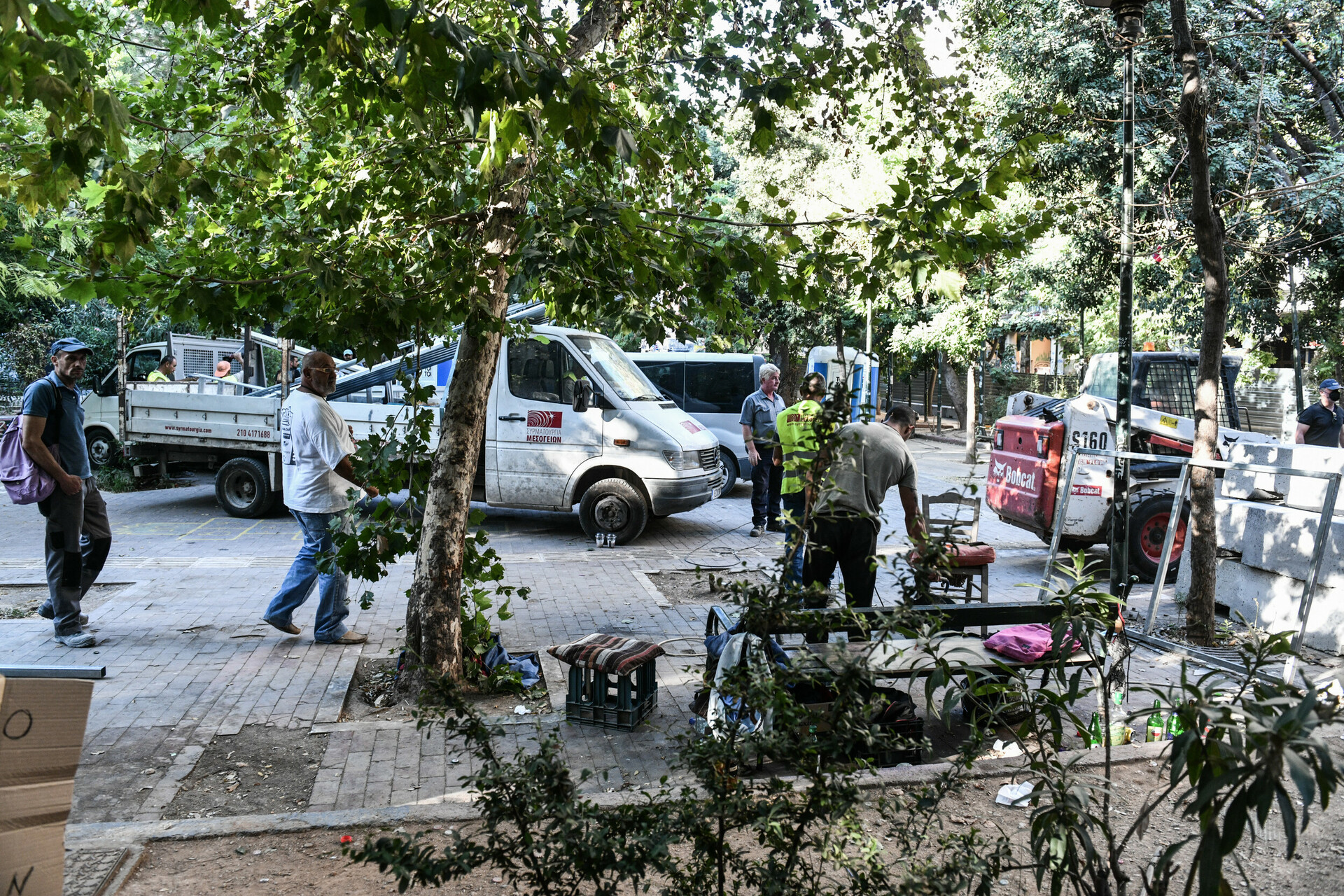 Από τα ξημερώματα, μπουλντόζες με την ισχυρή συνοδεία ΜΑΤ, περιέφραξαν με τσιμεντένιους φράχτες την πλατεία, ενώ συνεργεία προχώρησαν και σε κοπές δένδρων.