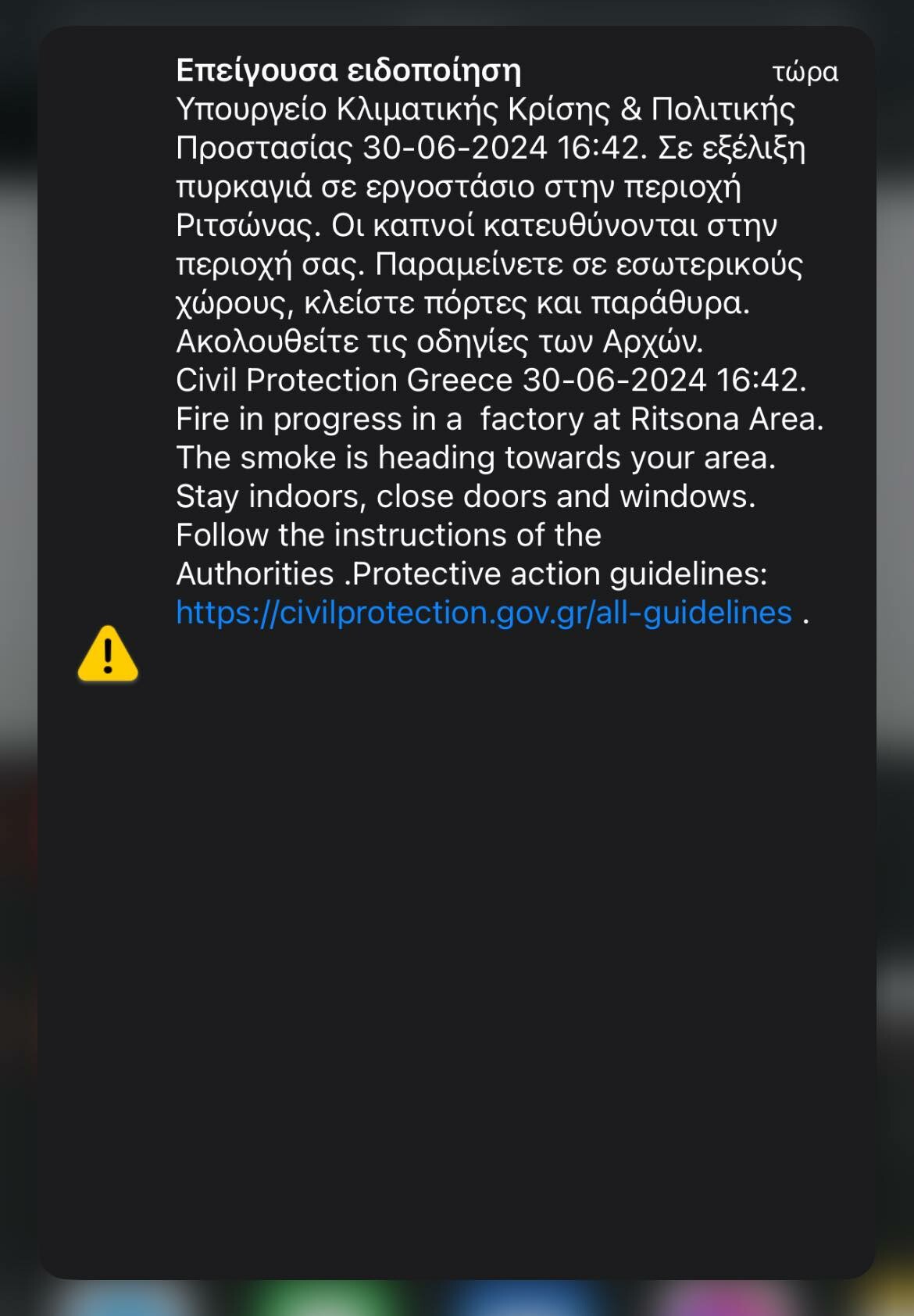Για τη φωτιά στη Ριτσώνα, εκδόθηκε μήνυμα 112 λόγω της επικινδυνότητας του καπνού: