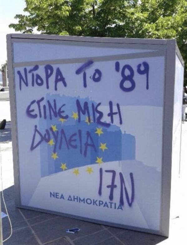 Άγνωστοι έγραψαν με σπρέι υβριστικά μηνύματα σε βάρος της Ντόρας Μπακογιάννη και του Κυριάκου Μητσοτάκη, με αναφορές στη δολοφονία του Παύλου Μπακογιάννη από την τρομοκρατική οργάνωση. «Ντόρα το '89 έγινε μισή δουλειά. 17Ν», έγραψαν στο προεκλογικό περίπτερο του κόμματος, υπονοώντας πως οι τρομοκράτες δεν δολοφόνησαν όλα τα μέλη της οικογένειας.
