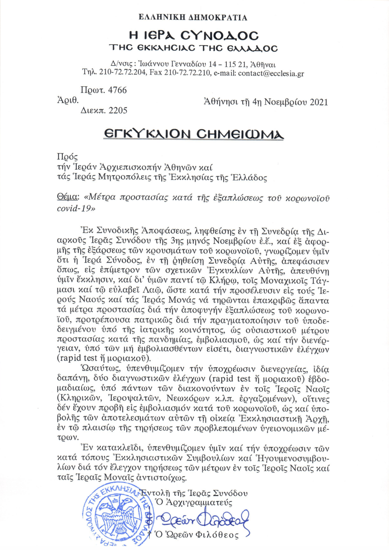 Σε εγκύκλιο που εξέδωσε, η Ιερά Σύνοδος καλεί όλους τους πιστούς και τον κλήρο να τηρούν «επακριβώς άπαντα τα μέτρα προστασίας», προτρέποντας τους ανεμβολίαστους πιστούς που επιθυμούν να εκκλησιαστούν, να προσέρχονται στους ιερούς ναούς αφότου υποβληθούν σε διαγνωστικό τεστ (rapid ή pcr).