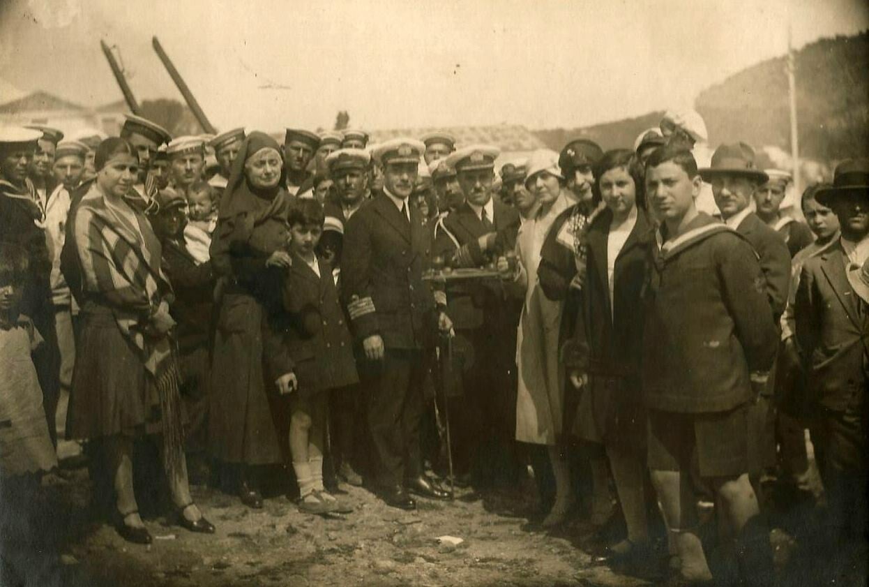 Το Πάσχα του 1928, η Άννα Μελά - Παπαδοπούλου, εθελόντρια νοσοκόμα, γνωστή ως «Η Μάννα του Στρατιώτου» φωτογραφίζεται με αξιωματικούς και ναύτες του Πολεμικού Ναυτικού.