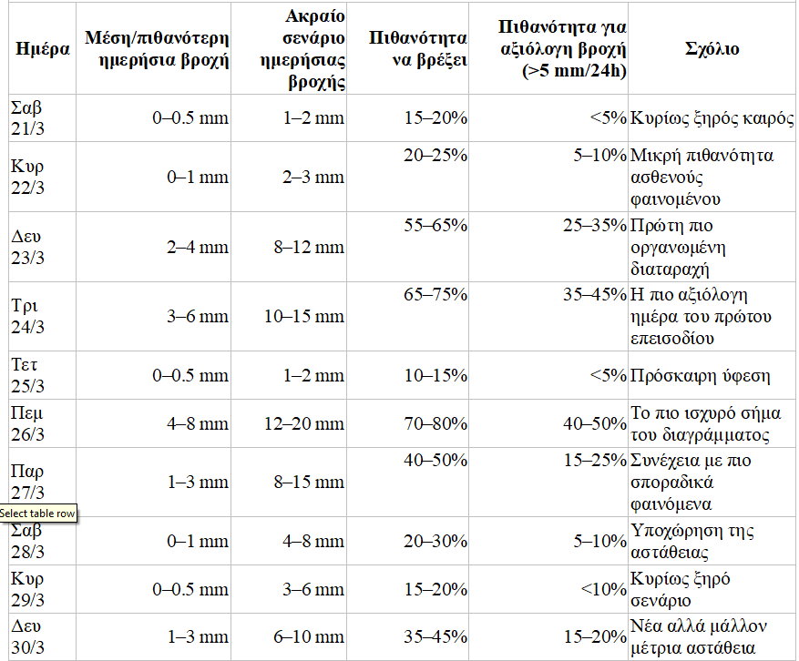 Η Πέμπτη 26 Μαρτίου ξεχωρίζει ως η ημέρα με τις περισσότερες πιθανότητες για πιο αξιόλογη βροχόπτωση, ενώ την Παρασκευή 27 Μαρτίου αναμένεται συνέχεια των φαινομένων, αλλά πιο τοπικού χαρακτήρα.