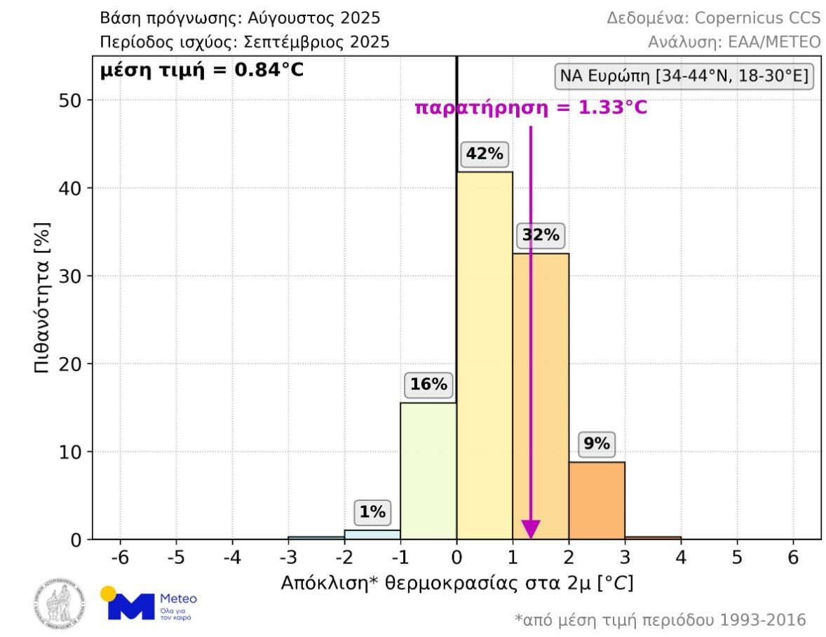 Υπενθυμίζεται ότι όσο αφορά τον περασμένο Σεπτέμβριο, η μέση θερμοκρασιακή απόκλιση στη νοτιοανατολική Ευρώπη ήταν +1.33°C, ενώ η μέση τιμή όλων των σεναρίων της μακροπρόθεσμης πρόγνωσης που εκδόθηκε τον Αύγουστο του 2025 ήταν +0.84°C. Όπως φαίνεται στο παρακάτω γράφημα, το μέγεθος της απόκλισης που παρατηρήθηκε, είχε πιθανότητα 32% και ήταν το 2ο πιθανότερο πεδίο τιμών στην μακροπρόθεσμη πρόγνωση.
