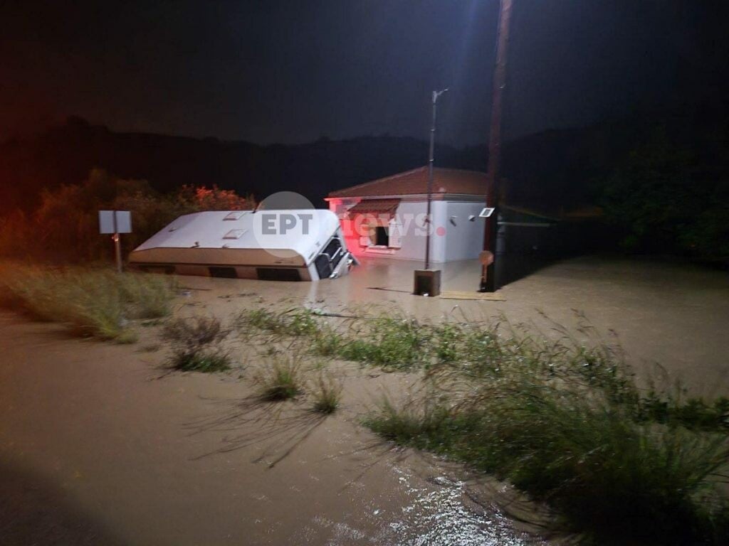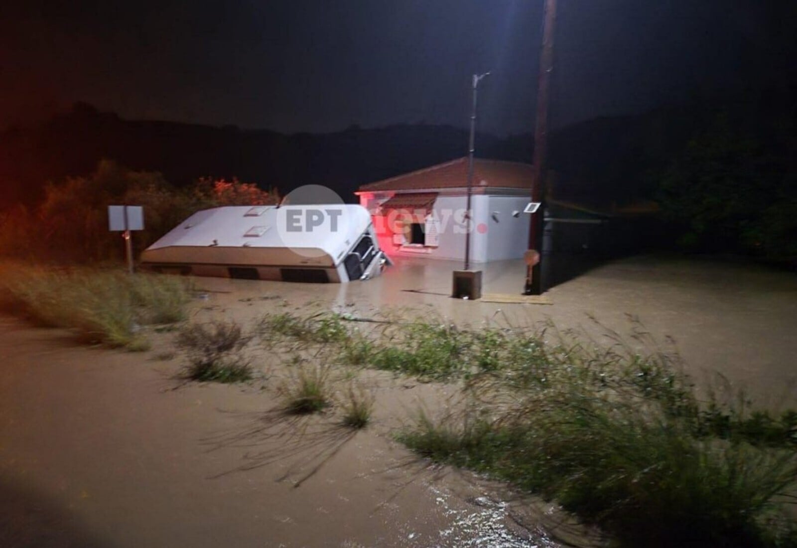 Σύμφωνα με την ΕΡΤ, δύο Γερμανοί τουρίστες κινδύνευσαν όταν το κατάλυμά τους, το όχημά τους και ένα τροχόσπιτο κατακλύστηκαν από τα νερά.