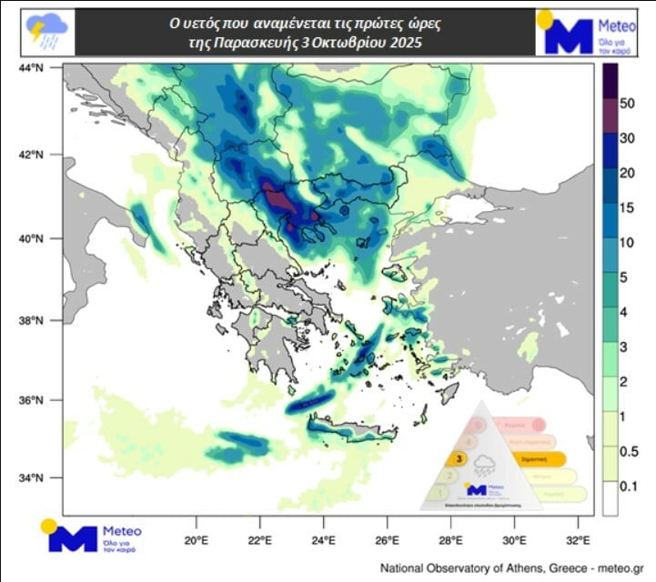 Στους σχετικούς χάρτες παρουσιάζεται ο υετός που αναμένεται αύριο, Παρασκευής 3 Οκτωβρίου:
