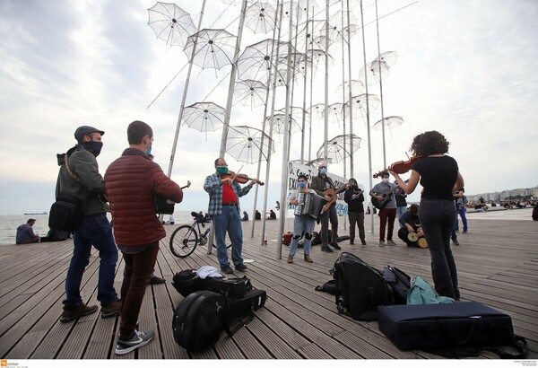 Μουσική διαμαρτυρία πραγματοποίησαν το απόγευμα καλλιτέχνες στη Θεσσαλονίκη διεκδικώντας επιδόματα που «να καλύπτουν τις καθημερινές ανάγκες τους».