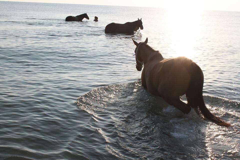 Τα άλογα κολυμπούν και μάλιστα είναι δεινοί κολυμβητές! Το κολύμπι, όπως για μας έτσι και γι' αυτά είναι ένας πολύ καλός τρόπος εκγύμνασης: Σαν υδροθεραπεία, γυμναστική με αντιστάσεις, χωρίς τραυματισμούς. Κάτι που πολύς κόσμος δεν ξέρει είναι ότι τα άλογα στο νερό (όχι πάντα και όχι όλα) κάνουν ένα πολύ περίεργο θόρυβο σαν μουγκρητό. Μάλιστα το ένα από τα άλογα μας, ο Ακκίλα, έδειχνε όλα τα μπροστά του δόντια (μάλλον για να μην μπει νερό) και παράλληλα μούγκριζε συνεχώς κι όλοι τον φοβούνταν! Για εμάς που ξέρουμε τί αθώος γίγαντας είναι, ήταν φοβερά διασκεδαστικό! Το πόνυ μας, ο Κούκι είχε μερικά περίσσεια κιλά που καταφέραμε να μετατρέψουμε σε μυς και ελπίζω πως μετά από αυτό το καλοκαίρι δε θα αντιμετωπίσουμε κανένα σοβαρό κτηνιατρικό θέμα. Ο Αραγκόν, ο μεγαλύτερος σε ηλικία και πιο ταλαιπωρημένος αφού έκανε 10 χρόνια κούρσες στον ιππόδρομο και έχει ένα σωρό κουσούρια στα πόδια του, έμπαινε θάλασσα στα ρηχά και πήγαινε πάνω-κάτω σαν παππούς!