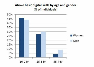 Στις ηλικίες άνω των 55 ετών, το ποσοστό γυναικών με ψηφιακές γνώσεις ανώτερες από τις απολύτως βασικές στην Ελλάδα είναι κάτω του 5%, έναντι σχεδόν 10% μεταξύ των ανδρών, ενώ στις ηλικίες 25-54 ετών το ποσοστό αυτό για τις γυναίκες είναι περίπου 27% (άνδρες 30%) και στις ηλικίες 16-24 ετών είναι 46% (άνδρες 44%).