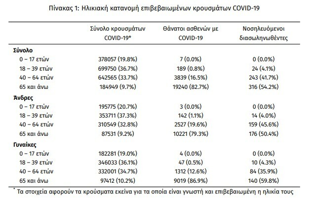 Παράλληλα, οι νέοι θάνατοι ασθενών με κορωνοϊό είναι 78, ενώ από την έναρξη της επιδημίας έχουν καταγραφεί συνολικά 23.275 θάνατοι. Το 95.0% είχε υποκείμενο νόσημα ή/και ηλικία 70 ετών και άνω.