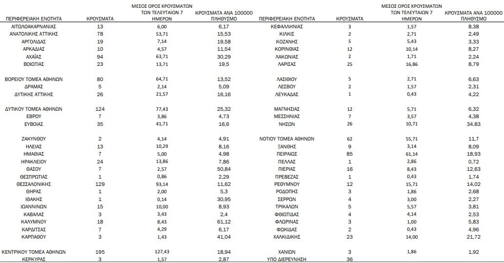 Στην Αττική καταγράφηκαν 676 νέα κρούσματα, στη Θεσσαλονίκη 129 και στην Αχαΐα 94. Υπό διερεύνηση βρίσκονται 36 κρούσματα.