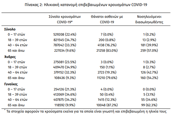 Αναφορικά με τους 454 ασθενείς που νοσηλεύονται διασωληνωμένοι, η διάμεση ηλικία τους είναι τα 67 έτη και το 65% είναι άνδρες. Το 87,4% των διασωληνωμένων έχει υποκείμενο νόσημα ή/και ηλικία 70 ετών και άνω. Από την αρχή της πανδημίας 4.241 ασθενείς έχουν εξέλθει από τις ΜΕΘ.