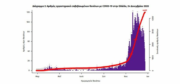 Τέλος, σε ό,τι αφορά τους 4.457 ανθρώπους που έχουν χάσει τη ζωή τους, οι 1.798 ήταν γυναίκες (40,3%). Η διάμεση ηλικία των θανόντων ήταν τα 79 έτη και το 95,5% είχε κάποιο υποκείμενο νόσημα ή/και ηλικία 70 ετών και άνω.