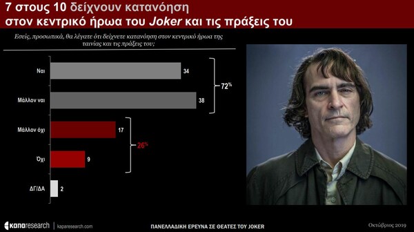 Μερικά ενδιαφέροντα αποτελέσματα προκύπτουν από έρευνα σε Έλληνες θεατές της πολυσυζητημένης ταινίας «Τζόκερ» που έκανε η εταιρεία δημοσκοπήσεων Κάπα Research.