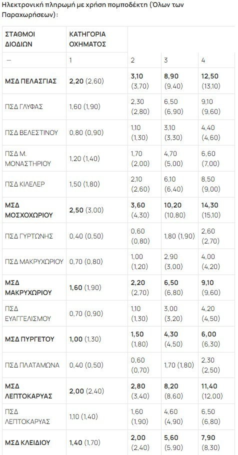 Έκπτωση ύψους 5%, η οποία αφορά αποκλειστικά τις διελεύσεις με χρήση πομποδέκτη (οποιασδήποτε Παραχώρησης). Η έκπτωση αυτή προστίθεται στην έκπτωση ύψους 7%, η οποία υφίσταται ήδη από τον παραχωρησιούχο. Για πληρωμή με μετρητά, θα συνεχίσουν να ισχύουν οι υφιστάμενες τιμές διοδίων.
