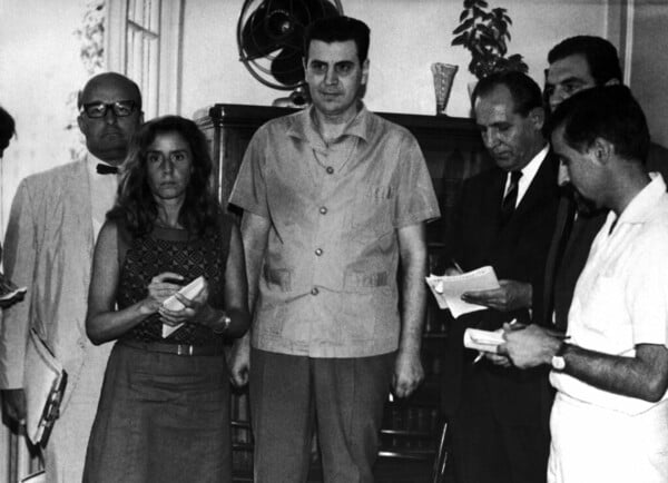 FacebookTwitter Ο Μίκης Θεοδωράκης στο σπίτι του στην Αθήνα, στις 27 Ιανουαρίου 1968, λίγο μετά την αποφυλάκισή του από τη χούντα λόγω αμνηστίας Χριστουγέννων. Στο πλευρό της συζύγου του, Μρυτώς, κρατάει στην αγκαλιά του την 9χρονη Μαργαρίτα και τον επτάχρονο Γιώργο - Πηγή φωτογραφίας: ΑΡ FacebookTwitter Ο Θεοδωράκης στα κεντρικά της γενικής ασφάλειας, στις 4 Σεπτεμβρίου του 1967, όπου του επετράπη από τη χούντα των συνταγματαρχών να συναντηθεί με εκπροσώπους του διεθνούς Τύπου - Πηγή φωτογραφίας: ΑΡ FacebookTwitter Μαζί με τον πατέρα του Γιώργο σε στούντιο ηχογράφησης στην Αθήνα, στις 21 Αυγούστου 1974 - Πηγή φωτογραφίας: ΑΡ FacebookTwitter Σε συνέντευξη Τύπου,στις 10 Ιουλίου του 1970, μετά την παραίτησή του ως εκπρόσωπος στην παγκόσμια συνέλευση νεολαίας στα Ηνωμένα Έθνη. Όπως είπε, δεν μπορούσε να παρευρίσκεται στην ίδια αίθουσα με εκπροσώπους της τυρρανικής εξουσίας που κυβερνούσε την Ελλάδα - Πηγή φωτογραφίας: ΑΡ FacebookTwitter Συνέντευξη Τύπου στην Ένωση Ξένων Ανταποκριτών στη Ρώμη, στις 13 1970, μία ημέρα μετά την άφιξή του στην ιταλική πρωτεύουσα στο πλαίσιο της εκστρατείας κατά της χούντας των συνταγματαρχών - Πηγή φωτογραφίας: ΑΡ FacebookTwitter Σε πηγαδάκι με τη Μαρία Φαραντούρη, σε διάλειμμα από ηχογράφηση, στις 21 Αυγούστου 1974 - Πηγή φωτογραφίας: ΑΡ FacebookTwitter Μία ενθουσιώδης Μελίνα Μερκούρη υποδέχεται τον Μίκη Θεοδωράκη στο αεροδρόμιο Λε Μπουρζέ του Παρισιού, στις 13 Απριλίου 1970. Μετά από θυελλώδεις διαμαρτυρίες διεθνών προσωπικοτήτων αφέθηκε ελεύθερος, καταλήγοντας στο Παρίσι, απ' όπου και απηύθυνε ξανά έκκληση για την ανάγκη πτώσης του δικτατορικού καθεστώτος - Πηγή φωτογραφίας: ΑΡ FacebookTwitter Η πανηγυρική επιστροφή του εξόριστου μουσικοσυνθέτη από τη Γαλλία στην Ελλάδα, στις 24 Ιουλίου του 1974 - Πηγή φωτογραφίας: Getty Images FacebookTwitter Ομιλία του Μίκη Θεοδωράκη σε διαδήλωση κατά του ΝΑΤΟ στη Ρώμη που οργάνωσε το κομμουνιστικό κόμμα Ιταλίας, στις 27 Μαΐου του 1970 - Πηγή φωτογραφίας: AP FacebookTwitter Μαζί με τον Ζουλφού Λιβανελί, πριν τη συναυλία για την προώθηση της ελληνοτουρκικής φιλίας, στην Κωνσταντινούπολη, στις 12 Οκτωβρίου του 1999 - Πηγή φωτογραφίας: ΕΡΑ FacebookTwitter Το 1974, μετά την πτώση της χούντας, ο Μίκης Θεοδωράκης επέστρεψε στην Ελλάδα και έδωσε δύο ιστορικές συναυλίες στο Στάδιο Καραϊσκάκη, όπου μπήκε υπό τις ιαχές ενός τεράστιου πλήθους. Τα πολιτικά τραγούδια του μεγάλου μουσικοσυνθέτη τραγούδησαν, μεταξύ άλλων, η Μαρία Φαραντούρη, ο Αντώνης Καλογιάννης, ο Γιώργος Νταλάρας, ο Νίκος Ξυλούρης - Πηγή φωτογραφίας: Eurokinissi FacebookTwitter Ο κινηματογραφικός Αλέξης Ζορμπάς, Άντονι Κουήν και ο Θεοδωράκης χορεύουν επί σκηνής στο ανοιχτό φεστιβάλ του Μονάχου όπου ο μουσικοσυνθέτης διηύθυνε το κοντσέρτο του για σόλο άλτο, μπουζούκι, χορωδία και ορχήστρα "Alexis Zorbas", στο πλαίσιο εκδηλώσεων για τα 70α γενέθλιά του - Πηγή φωτογραφίας: ΕΡΑ
