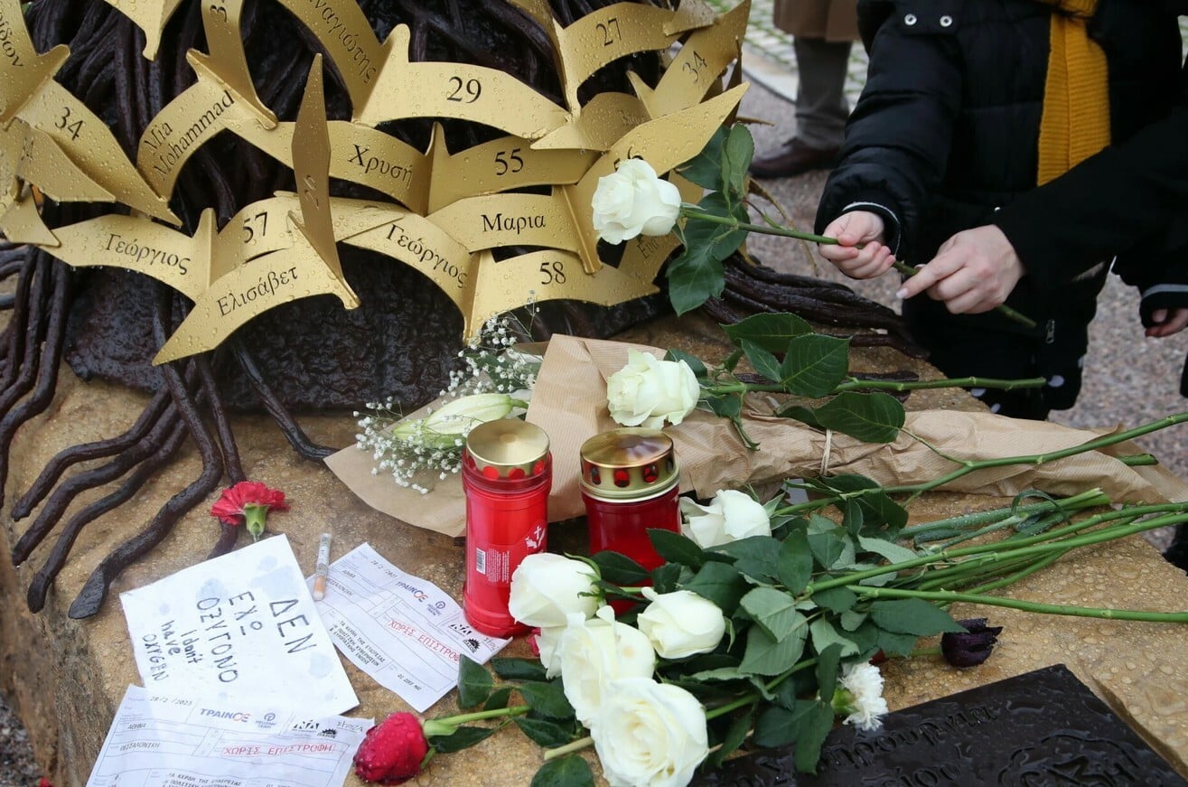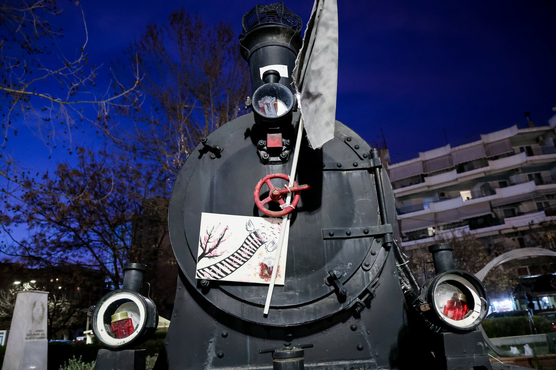 Μνημείο για τα 57 θύματα στα Τέμπη, υπάρχει και στην πλατεία του ΟΣΕ στη Λάρισα. Είναι το σημείο όπου κατέληξε η πορεία για τον ένα χρόνο από τη σιδηροδρομική τραγωδία.