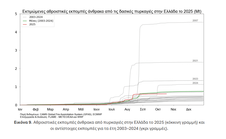 Η έκθεση επισημαίνει ότι οι εκπομπές διοξειδίου του άνθρακα από τις φετινές πυρκαγιές ήταν οι έβδομες υψηλότερες των τελευταίων δύο δεκαετιών. Σε ανθρώπινο επίπεδο, καταγράφηκε ένας θάνατος στην Κερατέα, 69 τραυματισμοί και ζημιές σε περισσότερα από 50 σπίτια. Το συνολικό κόστος για την καταστολή υπολογίζεται σε περίπου 584 εκατομμύρια ευρώ, εκ των οποίων σχεδόν τα 200 εκατομμύρια αφορούν μισθώσεις εναέριων μέσων. Για δράσεις πρόληψης δαπανήθηκαν περίπου 309 εκατομμύρια.