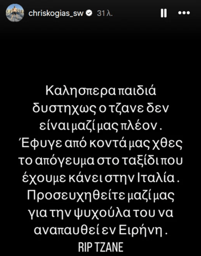 «Δυστυχώς, ο Τζάνε δεν είναι μαζί μας πλέον. Έφυγε από κοντά μας χθες το απόγευμα στο ταξίδι που έχουμε κάνει στην Ιταλία. Προσευχηθείτε μαζί μας για την ψυχούλα του να αναπαυθεί εν ειρήνη» έγραψε χαρακτηριστικά στην ανάρτησή του.