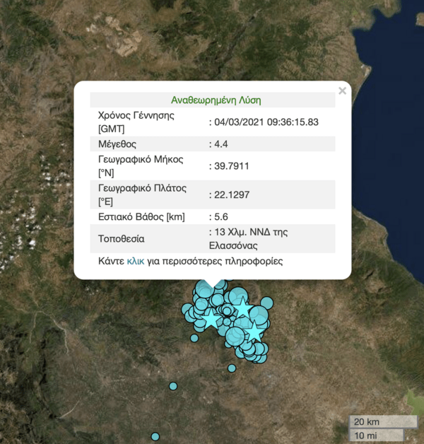 H νέα, μεσημεριανή δόνηση είχε εστιακό βάθος 5,6 χιλιόμετρα και το επίκεντρο εντοπίστηκε 13 χιλιόμετρα νοτιοδυτικά της Ελασσόνας. Συνολικά, πάνω από 100 μετασεισμοί έχουν σημειωθεί από χθες, ενώ ο διευθυντής του Γεωδυναμικού Ινστιτούτου, Άκης Τσελέντης, εκτιμά πως το ρήγμα του Τυρνάβου έχει εξαντλήσει το δυναμικό του. «Το ρήγμα του Τυρνάβου δεν μπορεί να δώσει σεισμό πάνω από 6 Ρίχτερ» δήλωσε χαρακτηριστικά.