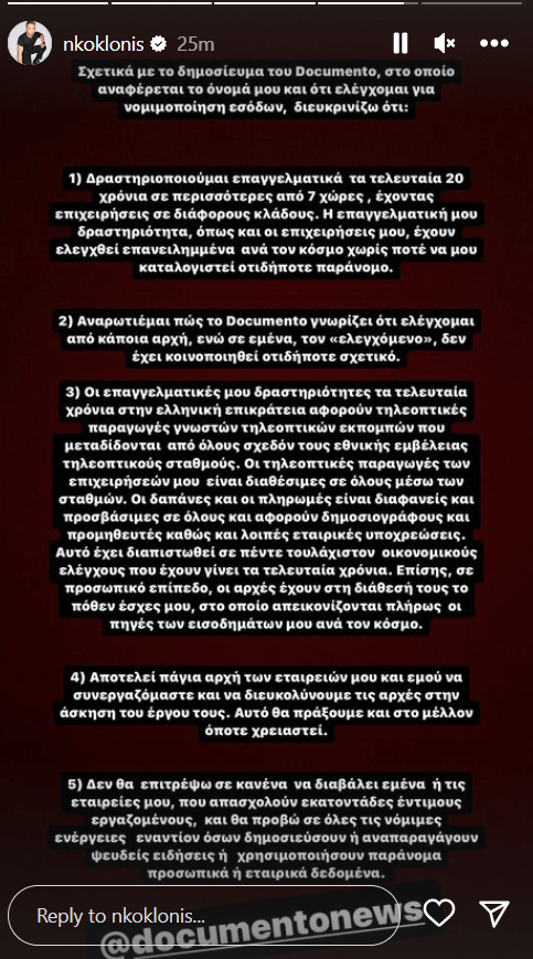 Απάντηση σε δημοσίευμα της εφημερίδας Documento που τον κατονομάζει ως τον παρουσιαστή που ελέγχεται για ξέπλυμα μαύρου χρήματος και εγκληματική οργάνωση δίνει ο Νίκος Κοκλώνης.