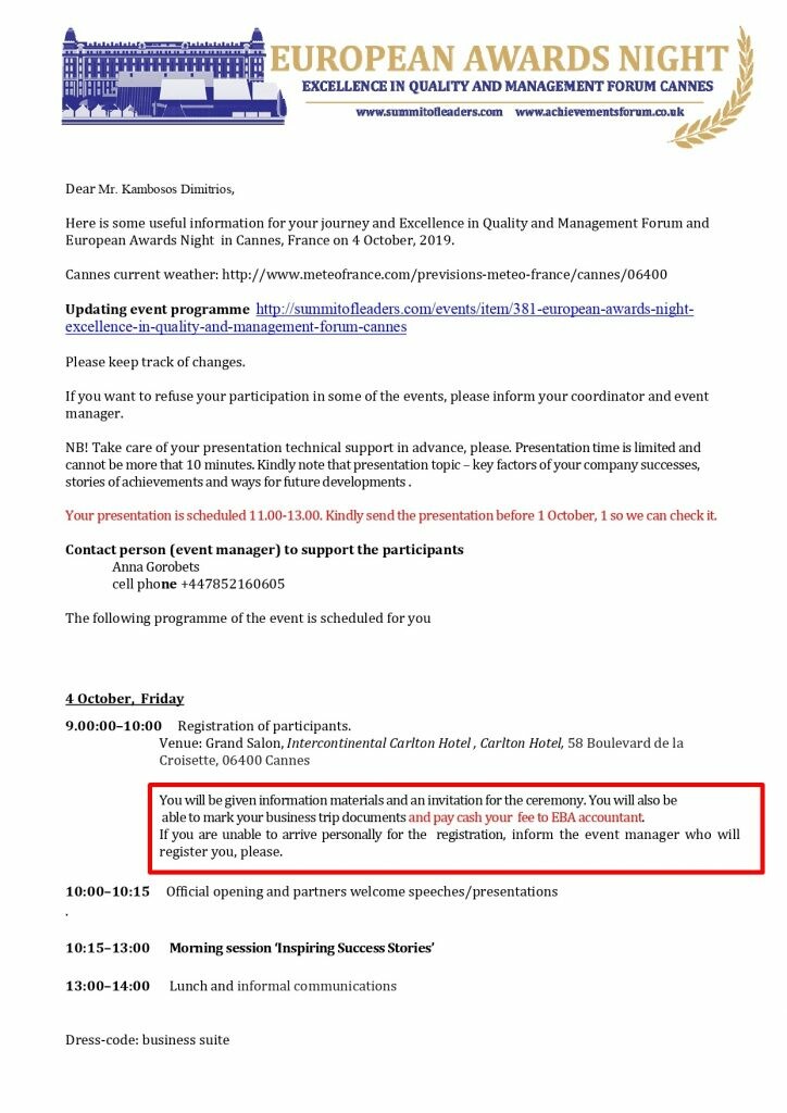Στο πρόγραμμα της εκδήλωσης που έστειλαν αναφέρουν ότι το ποσό θα πληρωθεί τοις μετρητοίς. Επίσης η οικονομική επιτροπή ενέκρινε ομόφωνα στις 23 Σεπτεμβρίου του 2019, τα έξοδα μετακίνησης καθώς και αποζημίωσης του Δημάρχου, κ. Καμπόσου. Αναλυτικά: 660 ευρώ για έξοδα παραμονής, 900 ευρώ δαπάνη των αεροπορικών εισιτηρίων και 200 ευρώ ημερήσια αποζημίωση. Συνολικό ποσό 3.400 ευρώ. Τέλος, η οικονομική επιτροπή αποφάσισε ομόφωνα την ίδια ημέρα να εγκρίνει την κάλυψη των εξόδων καθώς και την αποζημίωση του κ. Ροϊνιώτη με την ιδιότητα του μεταφραστή. Αναλυτικά: έξοδα διαμονής 160*3= 480 ευρώ, δαπάνη των αεροπορικών εισιτηρίων 900 ευρώ και 80*2 = 160 ευρώ ημερήσια αποζημίωση (Συνολικό ποσό 1.600 ευρώ). Συνολικό κόστος 8.950 ευρώ για βραβεία χωρίς καμιά αξία.