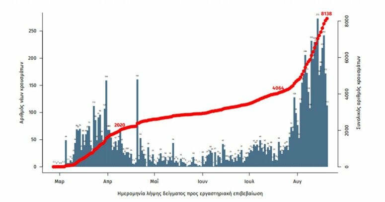 Από τα 8.138 κρούσματα που έχουν καταγραφεί έως τώρα, το 55.2% αφορά άνδρες. Οι 1.802 περιπτώσεις (22.1%) θεωρούνται σχετιζόμενες με ταξίδι από το εξωτερικό και 3.752 (46.1%) είναι σχετιζόμενες με ήδη γνωστό κρούσμα.