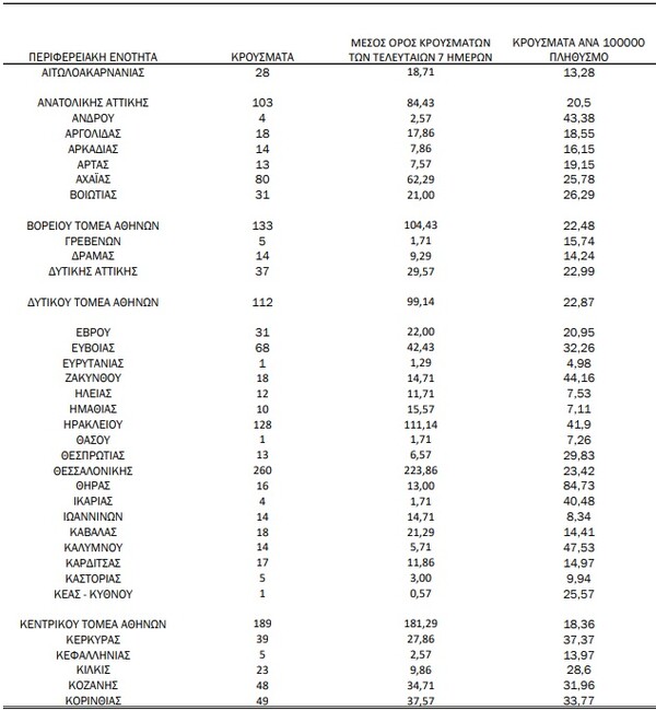 Στην Κρήτη τα περισσότερα νέα κρούσματα, 128, εντοπίστηκαν στο Ηράκλειο. Άλλες 107 μολύνσεις καταγράφηκαν στα Χανιά, 44 στο Ρέθυμνο και 18 στο Λασίθι.