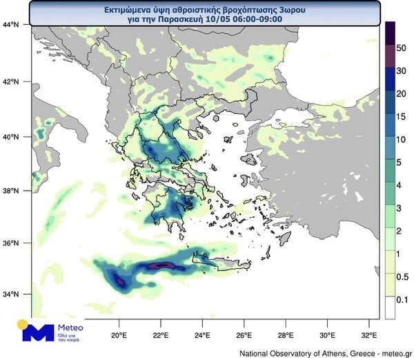 Σύμφωνα με τα προγνωστικά στοιχεία του meteo.gr / Εθνικού Αστεροσκοπείου Αθηνών, οι βροχές και οι καταιγίδες αναμένεται να συνεχιστούν σε μεγάλο μέρος της χώρας σήμερα Παρασκευή 10/05, με έμφαση κυρίως στα ανατολικά και νότια τμήματα. Σύμφωνα με την κατηγοριοποίηση των επεισοδίων βροχόπτωσης (Regional Precipitation Index), η οποία εφαρμόζεται από τη μονάδα Meteo του Εθνικού Αστεροσκοπείου Αθηνών, το επεισόδιο βροχόπτωσης για την Παρασκευή 10/05 κατατάσσεται στην Κατηγορία 3 (Σημαντική).