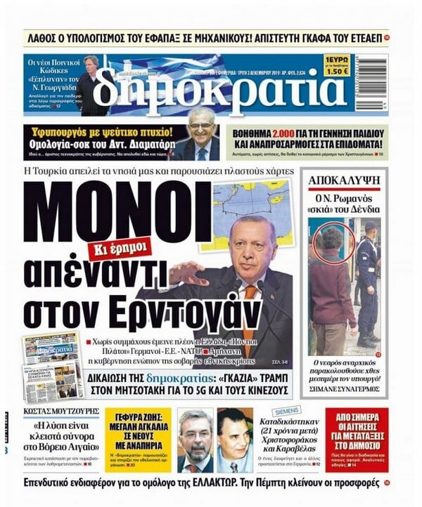 Το σχετικό πρωτοσέλιδο της εφημερίδας «Δημοκρατία» – Στα δεξιά το επίμαχο θέμα