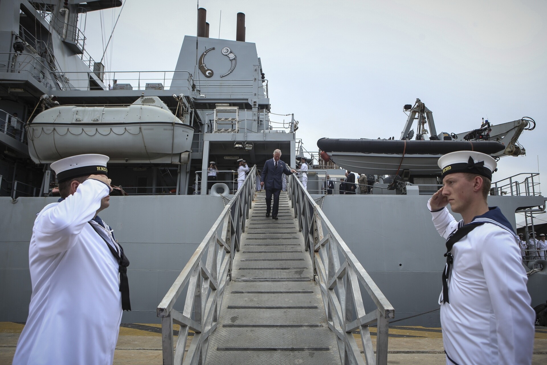 Λίγο πριν τις δύο το μεσημέρι, ο πρίγκιπας της Ουαλίας Κάρολος έφτασε από τον Πειραιά στο Φλοίσβο με την ακταιωρό της Βρετανικής Συνοριακής Δύναμης HMC Valiant, που συμμετέχει σε επιχειρήσεις έρευνας και διάσωσης προσφύγων και μεταναστών στο Αιγαίο.