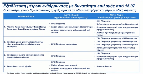 Στους μεικτούς χώρους αυτών των επιχειρήσεων η πληρότητα θα είναι στο 50%, θα απαιτείται αρνητικό rapid test για τους μη εμβολιασμένους, οι ανήλικοι θα προσέρχονται με δήλωση self test και η μάσκα θα είναι υποχρεωτική σε κινηματογράφους και θέατρα.