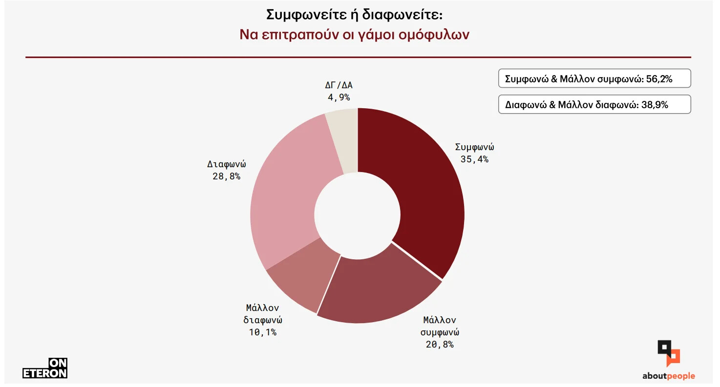 Οι γυναίκες (63,3%) εμφανίζονται πιο θετικές από ό,τι οι άνδρες (49%) απέναντι στον γάμο των ομόφυλων ζευγαριών, ενώ σε όλες τις ηλικιακές κατηγορίες υπερτερούν οι θετικές απαντήσεις. Το μεγαλύτερο ποσοστό καταγράφεται στην ηλικιακή ομάδα 17-24 ετών (67,7%) και το μικρότερο στις ηλικίες 65% (49,6%).