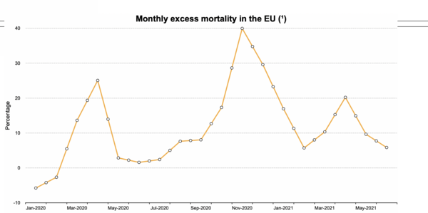 Τον Νοέμβριο του 2020, η υπερβάλλουσα θνησιμότητα στην ΕΕ είχε αγγίξει το 40% ενώ φέτος, ο Απρίλιος ήταν ο χειρότερος μήνας ως τώρα με 20,2%. Στα στοιχεία συνυπολογίστηκαν και τα δεδομένα από Ισλανδία, Λίχτενσταϊν, Νορβηγία και Ελβετία.