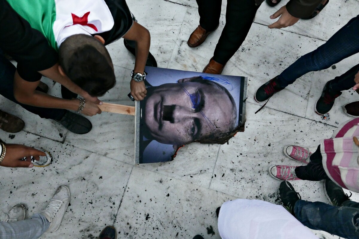 Οι διαδηλωτές, κυρίως πρόσφυγες από τη Συρία, έφτασαν στο Σύνταγμα έχοντας σε πλακάτ φωτογραφίες του Βλαντιμίρ Πούτιν στις οποίες είχαν σχεδιάσει το χαρακτηριστικό μουστάκι του Χίτλερ. Στη συνέχεια φώναξαν συνθήματα κατά της Ρωσίας, έσκισαν και έκαψαν τα πλακάτ με τον εικόνα του Ρώσου προέδρου.