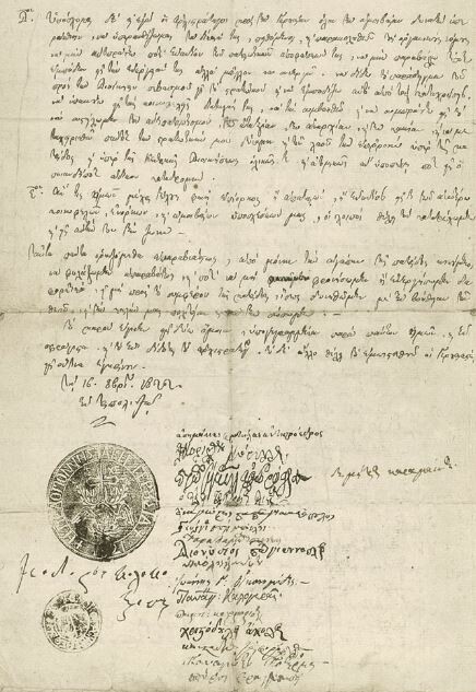 Ειδικότερα, πρόκειται για έγγραφο με τις υπογραφές του Θεόδωρου Κολοκοτρώνη και των μελών της Πελοποννησιακής Γερουσίας («Ασημάκης Φωτήλας Αντιπρόεδρος», «ο Κορίνθου Κύριλλος», «πρωτοσύγκελλος Αμβρόσιος [Φραντζής]», «ο Αρχ. Γρηγόριος Δίκαιος», «Αναγνώστης Παπαγιανακόπουλος [Δεληγιάννης]», «Γεώργιος Μπάλμπογλης» και 11 άλλοι), στο οποίο ορκίζονται να ενεργήσουν από κοινού για τη σωτηρία της πατρίδας και να αφήσουν κατά μέρος τα προσωπικά συμφέροντά τους.