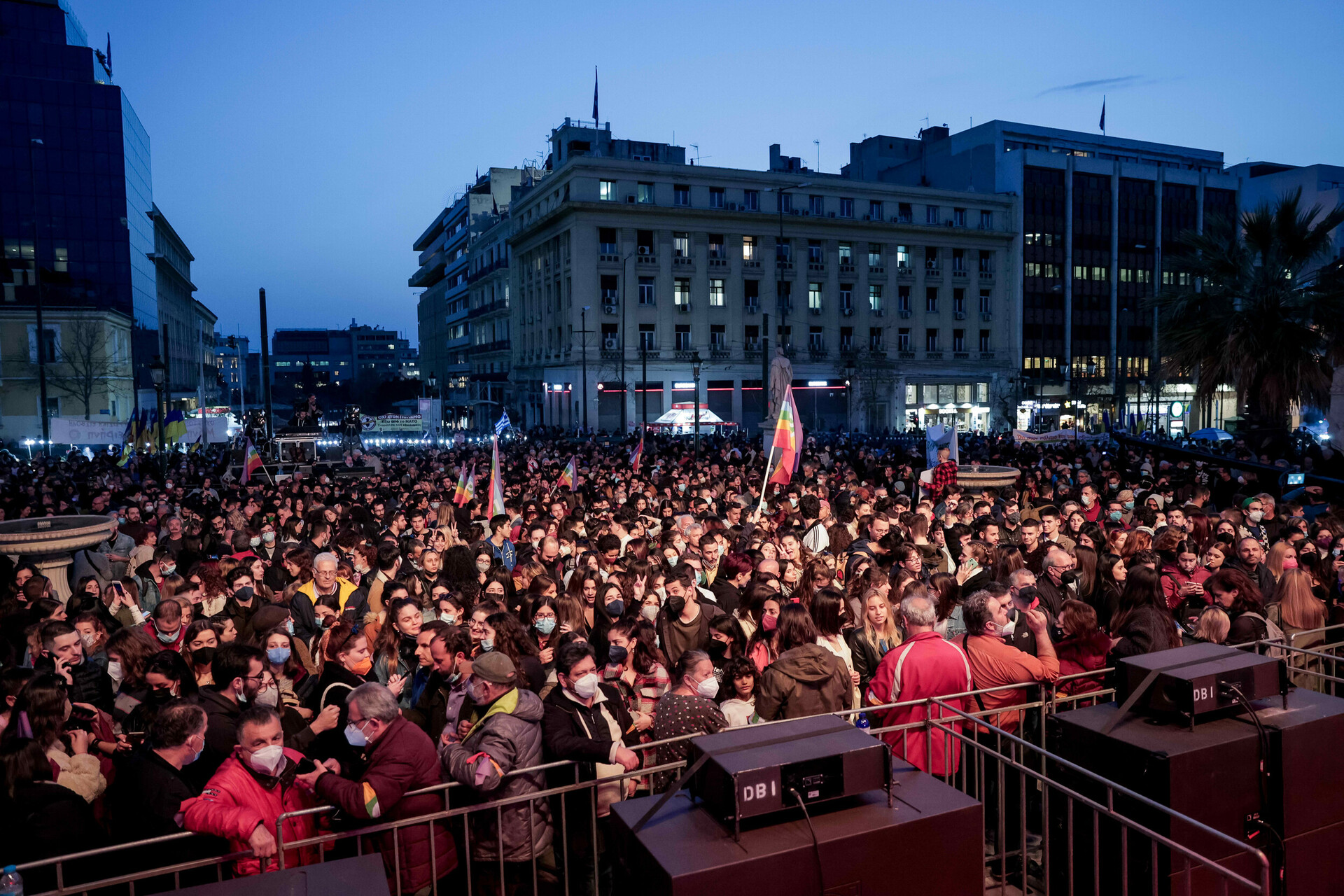 Πολίτες κάθε ηλικίας έχουν συγκεντρωθεί στα Προπύλαια για να παρακολουθήσουν τη συναυλία, ενώ έχει διακοπεί η κυκλοφορία στην οδό Πανεπιστημίου.