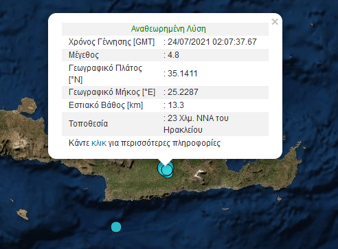 Σεισμός μεγέθους 4,8 βαθμών της κλίμακας Ρίχτερ σημειώθηκε τα ξημερώματα του Σαββάτου στην Κρήτη.