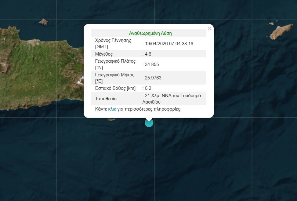 Την ίδια ώρα, το Ευρωμεσογειακό Ινστιτούτο μεταφέρει πως ο σεισμός στο Λασίθι ήταν μεγέθους 4,6 Ρίχτερ.