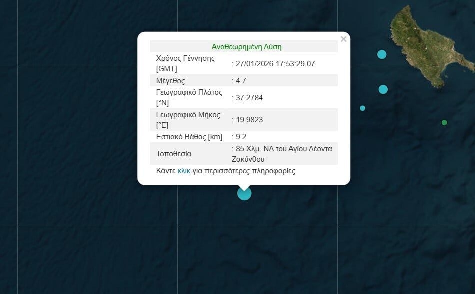 Το εστιακό βάθος του σεισμού στο Ιόνιο Πέλαγος υπολογίζεται στα 9,2 χιλιόμετρα, ενώ το επίκεντρό του εντοπίζεται 85 χιλιόμετρα νοτιοδυτικά του Αγίου Λέοντα, στη Ζάκυνθο.