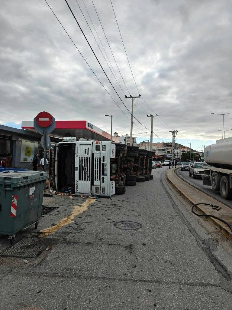 Μία νταλίκα, κάτω από αδιευκρίνιστες μέχρι στιγμής συνθήκες, ανατράπηκε και έπεσε πάνω σε ένα αυτοκίνητο, έξω από βενζινάδικο.