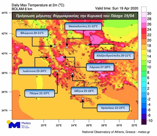 Στο χάρτη που ακολουθεί φαίνεται η αναμενόμενη κατανομή της μέγιστης θερμοκρασίας στη χώρα την Κυριακή του Πάσχα (19/04) καθώς και ενδεικτικές τιμές της σε επιλεγμένες πόλεις.