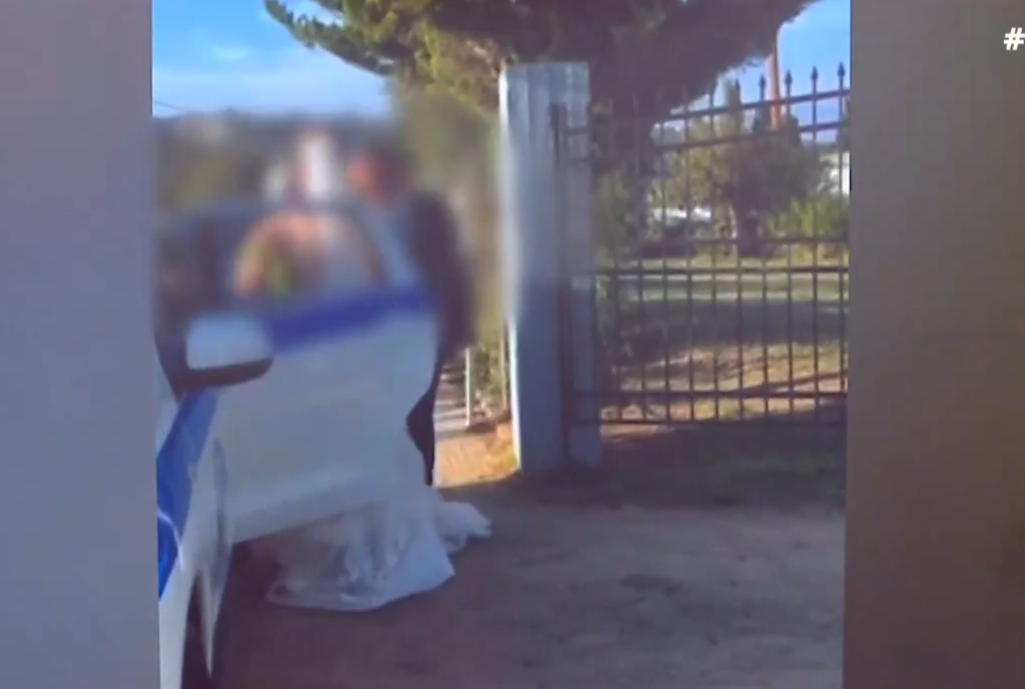 Βίντεο που παρουσίασε το Mega, δείχνει μία νύφη να φτάνει στην εκκλησία συνοδευόμενη από περιπολικό και μοτοσικλέτα της αστυνομίας.