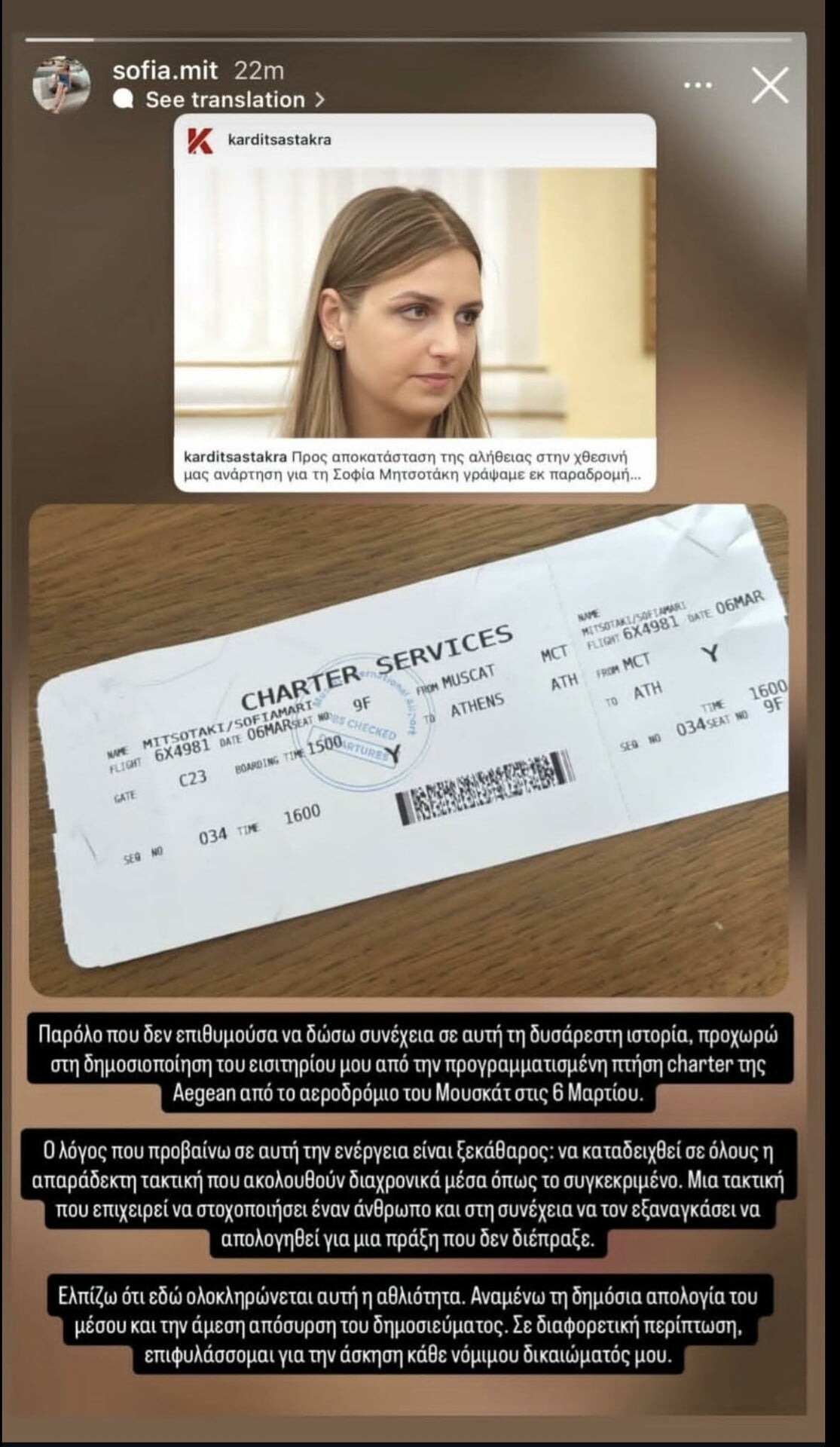 «Παρόλο που δεν επιθυμούσα να δώσω συνέχεια σε αυτή τη δυσάρεστη ιστορία, προχωρώ στη δημοσιοποίηση του εισιτηρίου μου από την προγραμματισμένη πτήση charter της Aegean από το αεροδρόμιο του Μουσκάτ στις 6 Μαρτίου», ανέφερε αρχικά.