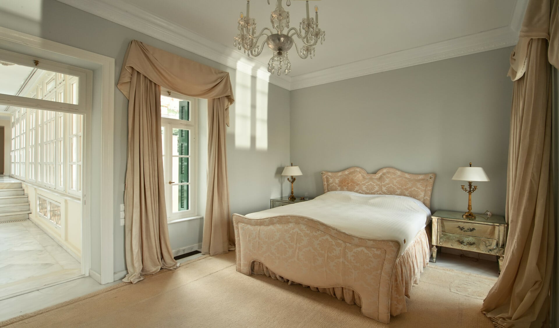 Στο εσωτερικό, οι χώροι χαρακτηρίζονται από μαρμάρινα δάπεδα, μεγάλα ανοίγματα φωτός και μια κλασική αισθητική που συνδυάζει αντίκες και έργα τέχνης με σύγχρονες ανέσεις. Οι κύριοι χώροι —σαλόνι, τραπεζαρία και κουζίνα— βρίσκονται στο πρώτο επίπεδο, ενώ τα υπνοδωμάτια καταλαμβάνουν τον δεύτερο όροφο.