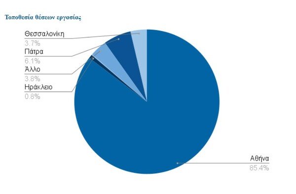 Το 85% των θέσεων εργασίας που περιλήφθηκαν στη μελέτη βρίσκονται στην Αθήνα. Το γεγονός αυτό δεν είναι απαραίτητα ενδεικτικό της ευρύτερης αγοράς, καθώς η πλειοψηφία των συμμετεχόντων εταιρειών έχουν την έδρα τους στην Αθήνα. Σε κάθε περίπτωση, αναμένεται πως, δεδομένης επίσης της άνθησης της τηλεργασίας, η κατανομή αυτή πρόκειται να αλλάξει.