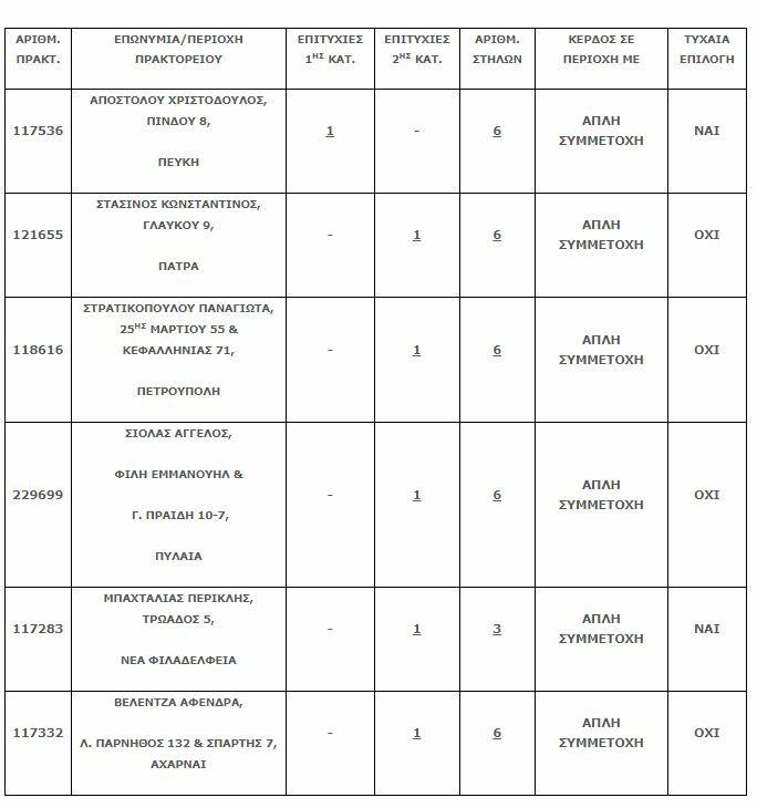 Τα πέντε τυχερά δελτία της δεύτερης κατηγορίας (5 επιτυχίες) οι κάτοχοι των οποίων κερδίζουν από 26.800 ευρώ συμπληρώθηκαν σε Πάτρα, Πετρούπολη, Πυλαία, Νέα Φιλαδέλφεια και Μενίδι.