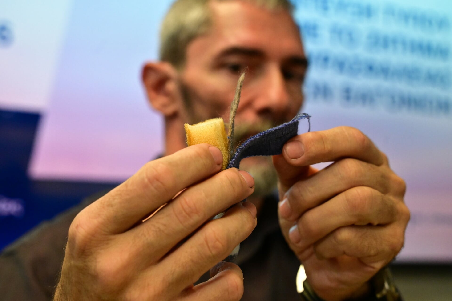 Ο Κώστας Λακαφώσης παρουσιάζει τα υλικά των καθισμάτων/Φωτογραφία: Eurokinissi